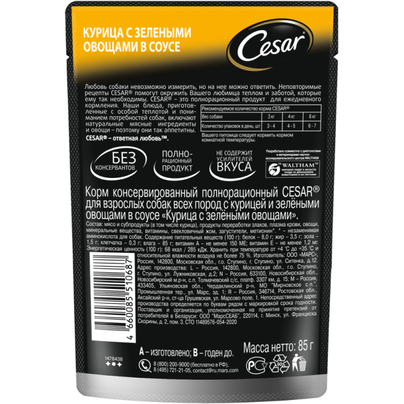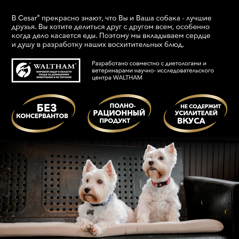 Аппетитные блюда CESAR® – это вкусные, сбалансированные рационы для собак, которые помогут окружить вашего любимца заботой и вниманием. Рационы готовятся по уникальной рецептуре, в состав входят натуральные ингредиенты: они не содержат искусственных красителей, усилителей вкуса и консервантов.