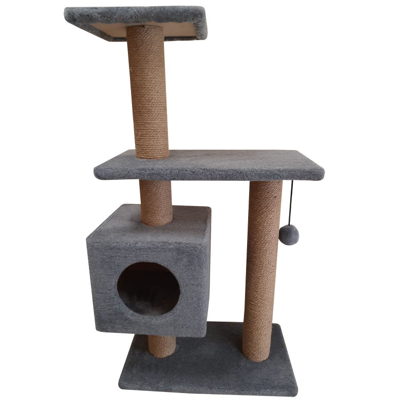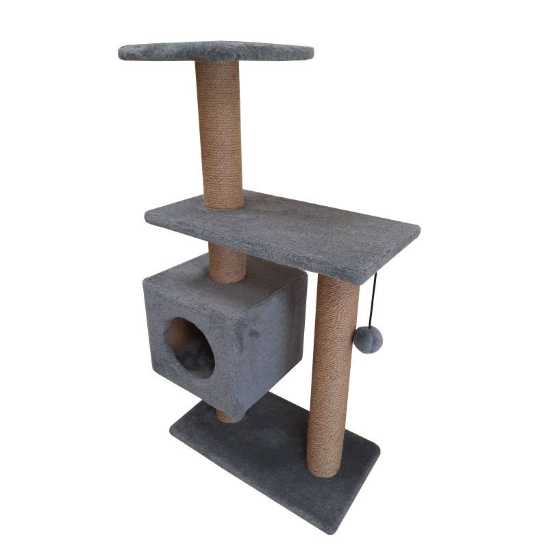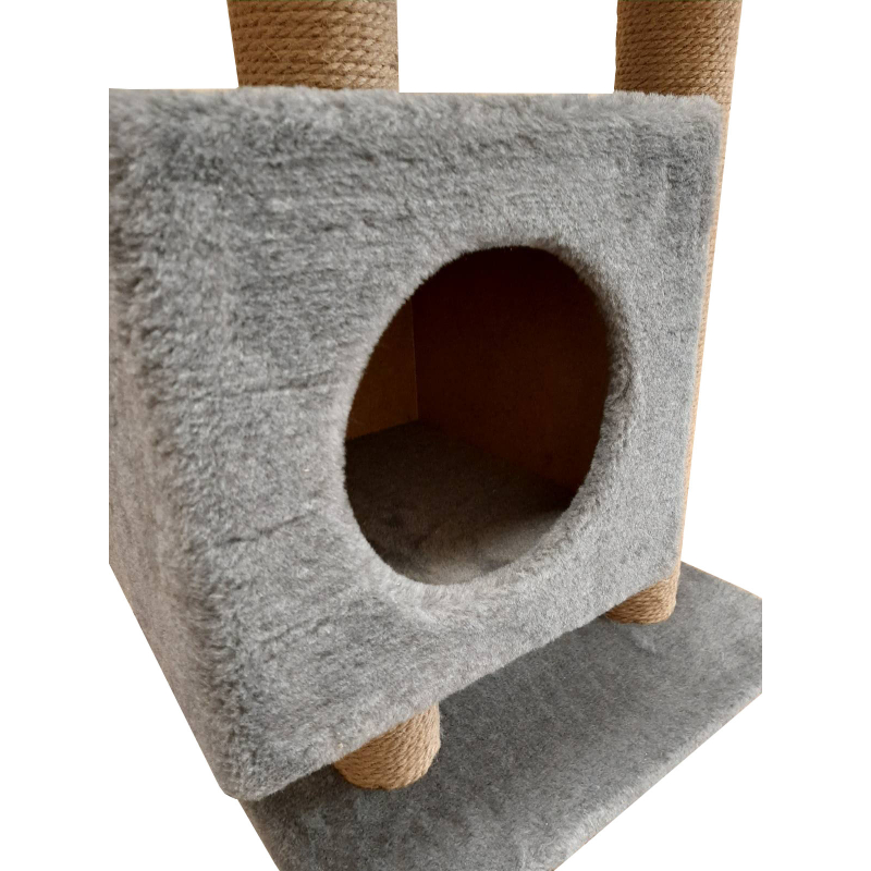 Поточить коготки можно о четыре разноуровневые столбика, обкрученные джутом. Когда все дела сделаны, питомца ждет уютный домик - настоящий кошачий рай.
