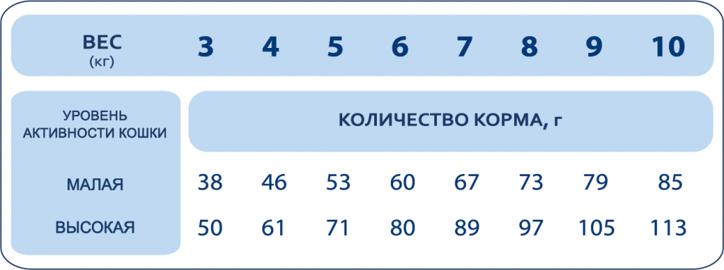 Рекомендации по применению: корм готов к употреблению. Суточная норма может варьироваться в зависимости от индивидуальных потребностей животного. Смотрите таблицу.