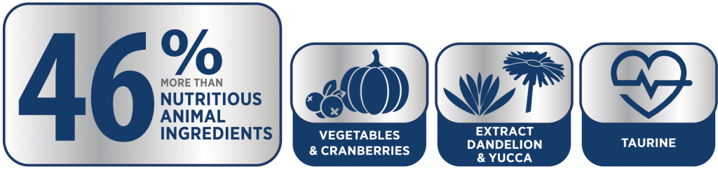 Состав: продукты животного происхождения более 46 % (свежее мясо рыбы, дегидратированное мясо и мясопродукты, рыбий жир, гидролизат из мяса), рис, картофель, кукуруза и продукты ее переработки, растительные масла, люцерна, клетчатка пищевая, тыква, яблоки, клюква, корень цикория, экстракт одуванчика 400 мг/кг, юкка Шидигера, меланж, жом из сахарной свеклы, ферменты, натрия хлорид, калия хлорид, таурин, витамины, микроэлементы, антиоксиданты.
