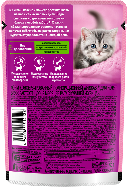 - для здорового роста и правильного развития корм Whiskas для котят содержит оптимальное сочетание питательных веществ, витаминов и минералов;
