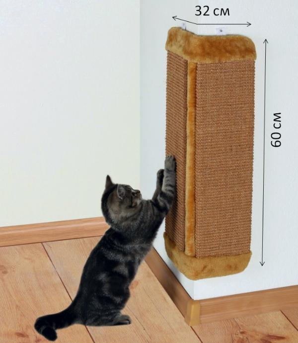 Обратите внимание на угловую настенную когтеточку "TRIXIE" с креплением на угол. Она решит проблему точения когтей, а также позволит коту размяться и потянуть спинку. Кошачья мята, добавленная в сизаль, гарантированно привлечет внимание любимца. Общий размер - 32х60 см., сизалевые поверхности - 14х46 см.