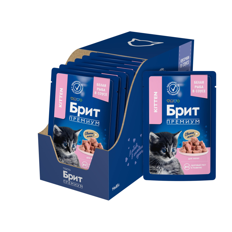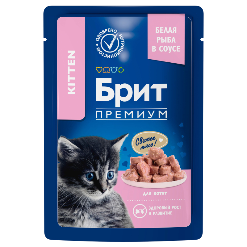 Brit Premium Cat Pouches Chunks for Kitten (белая рыба) - это нежные кусочки в ароматном соусе, идеальное сочетание для полноценного и сбалансированного рациона. Паучи однозначно заинтересуют вашу кошку и станут для нее любимым блюдом. Влажный корм содержит все необходимые витамины и минералы, которые необходимы котенку.