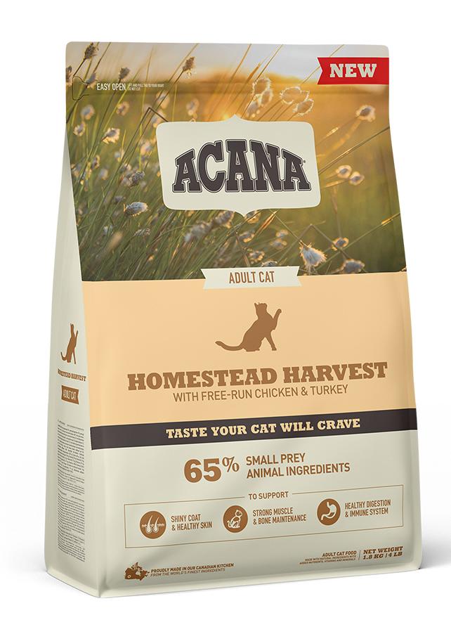 ACANA HOMESTEAD HARVEST Cat (курица, индейка) - это низкозерновой корм для взрослых кошек всех пород. 65% мяса / цельный овёс, овощи, фрукты и травы.