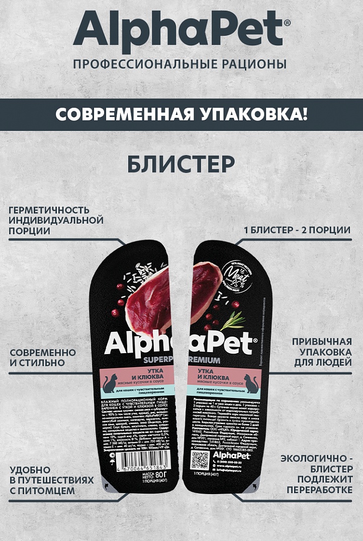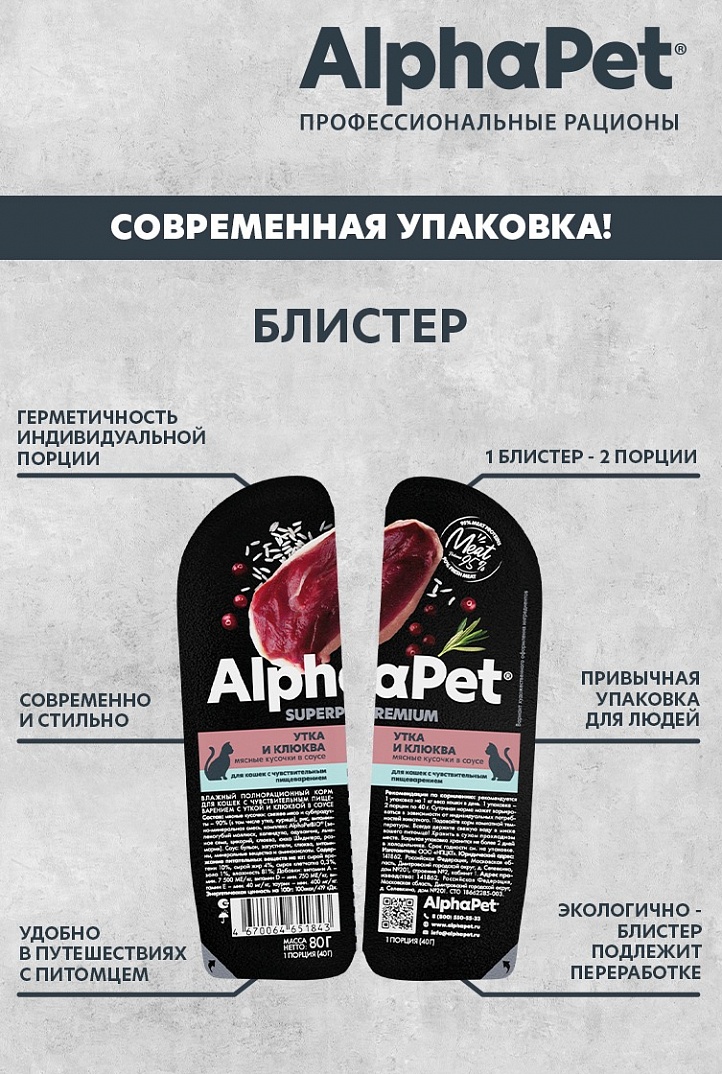 AlphaPet влажный полнорационный корм для кошек с чувствительным пищеварением с уткой и клюквой в соусе.