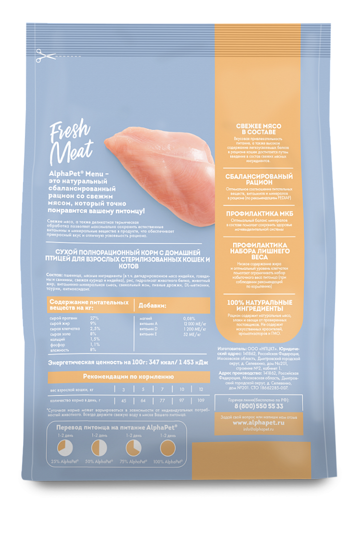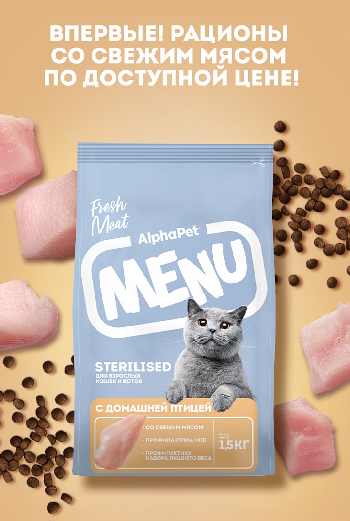 AlphaPet Menu сухой корм для взрослых стерилизованных кошек,с домашней птицей,1,5кг