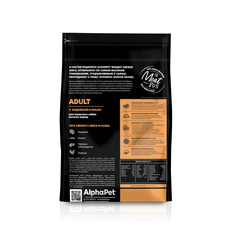 Ингредиенты: Свежее мясо и рыба 30% (ягненок, хамса, говяжий рубец, курица), дегидрированное мясо домашней птицы 20,5%, рис 10%, животный жир, ячмень, чечевица, яблоко, гидролизованная куриная печень, картофель, желтый горошек, витаминно-минеральная смесь сушеная мякоть сахарной свеклы, морковь, пивные дрожжи, комплекс AlphaPetBIO (зеленогубый моллюск, одуванчик, льняное семя, розмарин, цикорий, томаты, Юкка Шидигера), рыбий жир, DL-метионин, антиоксидант.