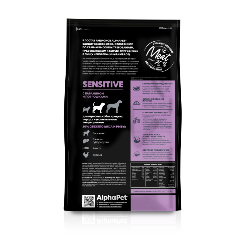 AlphaPet сухой корм для взрослых собак средних пород с чувствительным пищеварением, с бараниной,2кг