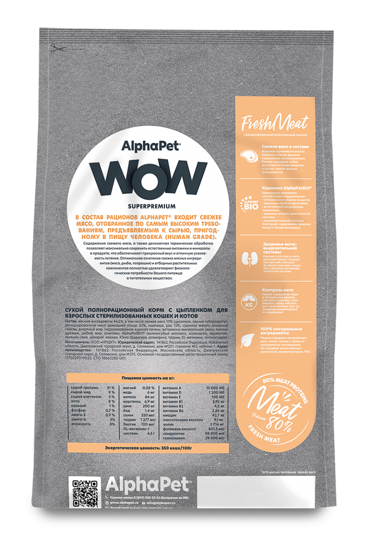 AlphaPet WOW сухой корм для стерилизованных кошек,c цыпленком,1,5кг