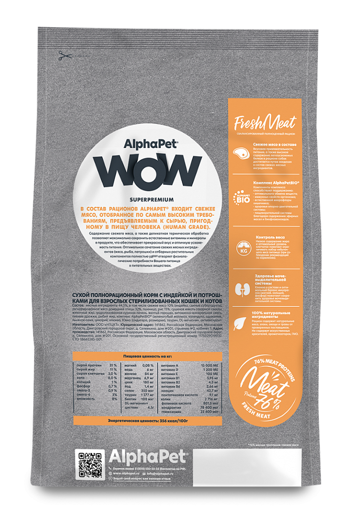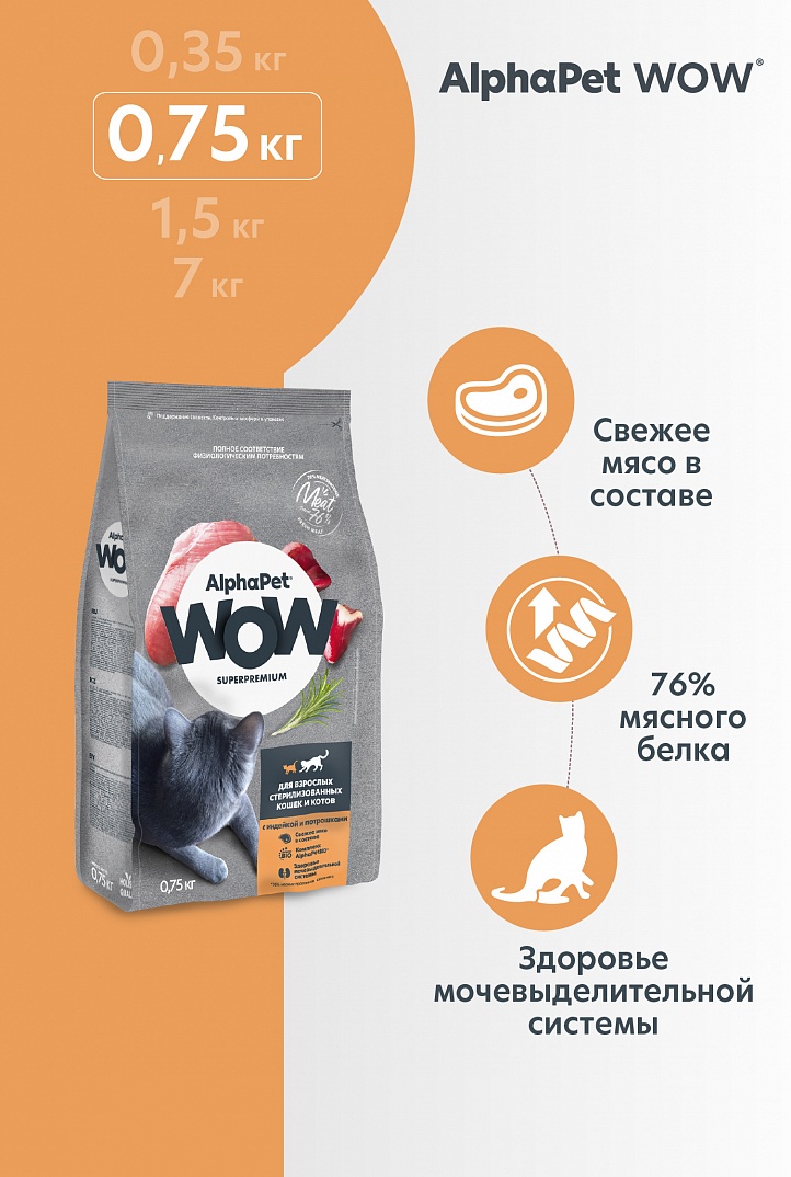 AlphaPet WOW сухой корм для стерилизованных кошек,с индейкой и потрошками, 0,75кг