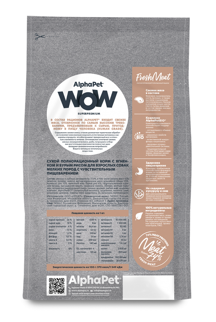 AlphaPet WOW Superpremium Dog Sensitive Mini Adult (Ягненок с бурым рисом) – сухой полнорационный корм с ягненком и бурым рисом для взрослых собак мелких пород с чувствительным пищеварением.
