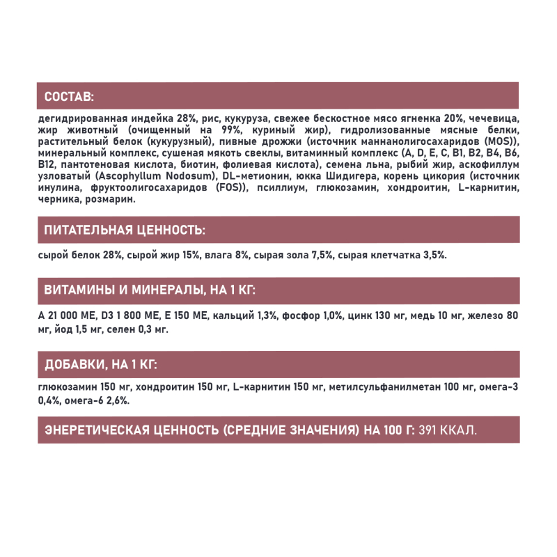 дегидрированная индейка 28%, рис, кукуруза, свежее бескостное мясо ягненка 20%, чечевица, жир животный (очищенный на 99%, куриный жир), гидролизованные мясные белки, растительный белок (кукурузный), пивные дрожжи (источник маннанолигосахаридов (MOS)), минеральный комплекс, сушеная мякоть свеклы, витаминный комплекс (A, D, E, C, B1, B2, B4, B6, B12, пантотеновая кислота, биотин, фолиевая кислота), семена льна, рыбий жир, аскофиллум узловатый (Ascophyllum Nodosum), DL-метионин, юкка Шидигера, корень цикория (источник инулина, фруктоолигосахаридов (FOS)), псиллиум, глюкозамин, хондроитин, L-карнитин, черника, розмарин.