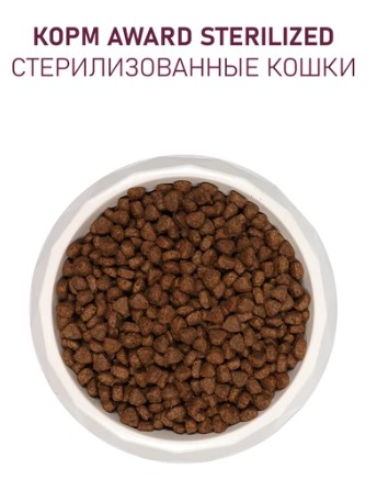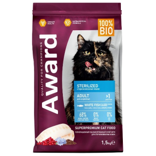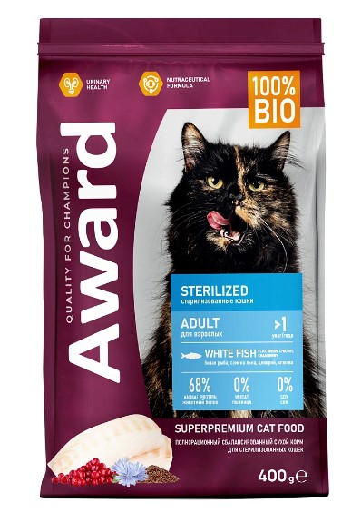 Award Cat Sterilized (Белая рыба) — сухой корм для взрослых стерилизованных кошек с белой рыбой с добавлением семян льна, клюквы и цикория.