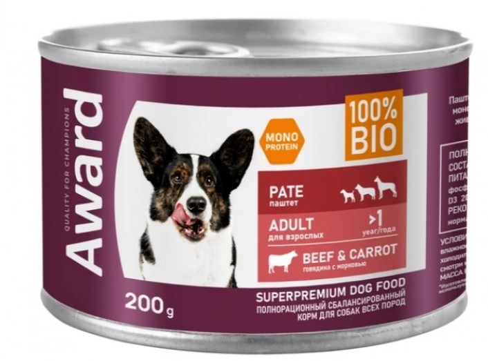 Award Dog Паштет (Говядина с морковью) — влажный корм для взрослых собак.