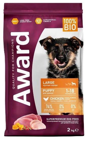 Award Puppy Large (Курица, индейка)— сухой корм для щенков крупных пород от 1 месяца с добавлением тыквы и шиповник.