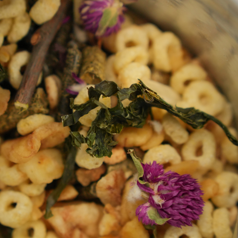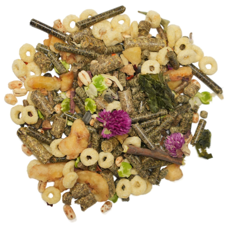 СОСТАВ: гранулы из смеси трав (райграсс, тимофеевка, мятлик), гранулы из люцерны, мультивитаминные гранулы (зернопродукты, травяная мука, свекловичный жом, дрожжи, витаминно-минеральный премикс), плющеный горох, семечки подсолнечника, колечко экструдированное, свекла, плоды шиповника, морковь, сушеные яблоки, чипсы банана, ячмень воздушный, паприка, березовые веточки, цветы клевера, ламинария, юкка шидигера, комплекс пробиотиков, натуральный адсорбент – дрожжи (S.cerevisae). Питательная ценность на 100г : белки 12,99%, жиры 1,12%, углеводы 25,29%, клетчатка 21,8%, зола 3,68%, полиненасыщенные жирные кислоты (включая омега-3, 6 и 9) 1,62%, влага 4,50%, кальций 390,24 мг, фосфор 180,27 мг, калий 794,40 мг, медь 0,53 мг, марганец 1,78 мг, цинк 3,13 мг, витамин А 72,85 мкг, витамин С 19,85 мг, витамин В1 0,75 мг, витамин В3 13,71 мг, витамин В12 0,90 мкг. Энергетическая ценность на 100г: 93,01 ккал.