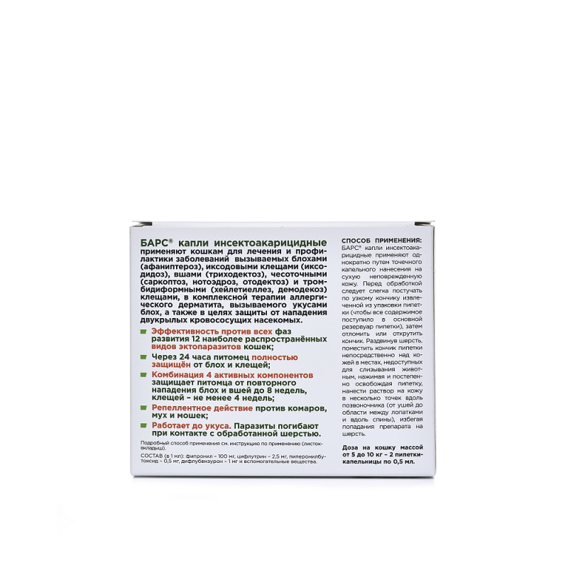 БАРС® капли инсектоакарицидные для кошек в качестве действующих веществ в 1 мл содержит фипронил – 100 мг, цифлутрин – 2,5 мг, пиперонилбутоксид – 0,5 мг, дифлубензурон – 1 мг.