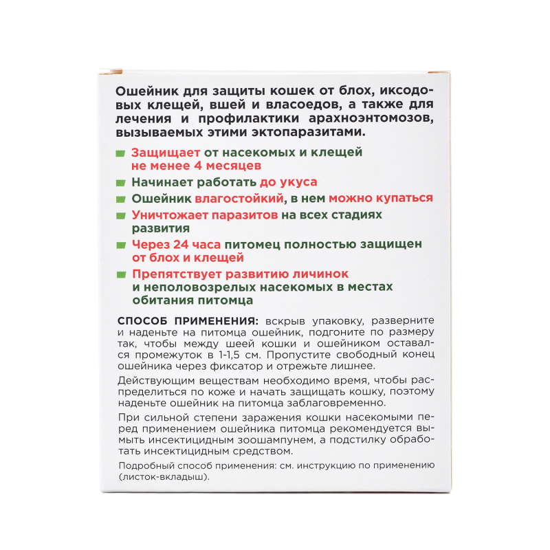 Непрерывное использование ошейника БАРС® обеспечивает защиту от иксодовых клещей, блох и других насекомых не менее 4 месяцев.