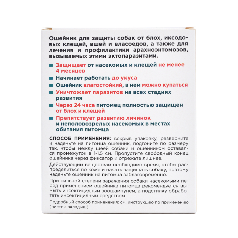 Непрерывное использование ошейника БАРС® обеспечивает защиту от иксодовых клещей, блох и других насекомых не менее 4 месяцев.