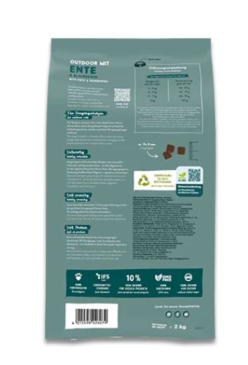 Свежее мясо курицы (20 %), белок из птицы (сушеный), ячмень, животный жир, кукуруза, свежая утка (5 %), кукурузный белок, сушеный свекольный жом (обессахаренный), белковый гидролизат, семена льна, картофельный белок, мука, карбонат кальция, масло лосося (0,5 %), горох (сушеный, 0,4 %), хлорид калия, ягоды брусники (сушеные, 0,1 %), ягоды голубики (сушеные, 0,1 %), петрушка сушеная (0,1 %), дрожжи (сушеные, 0,1 %), цветы календулы (сушеные, 0,05 %).