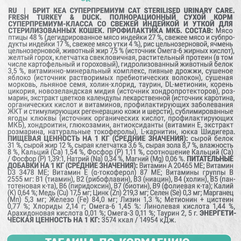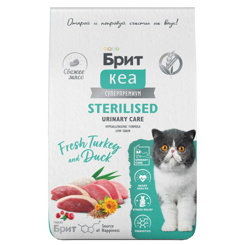 БРИТ КЕА Супер Премиум Sterilised Urinary сухой корм для стерилизованных кошек, профилактика МКБ (индейка и утка) 7кг