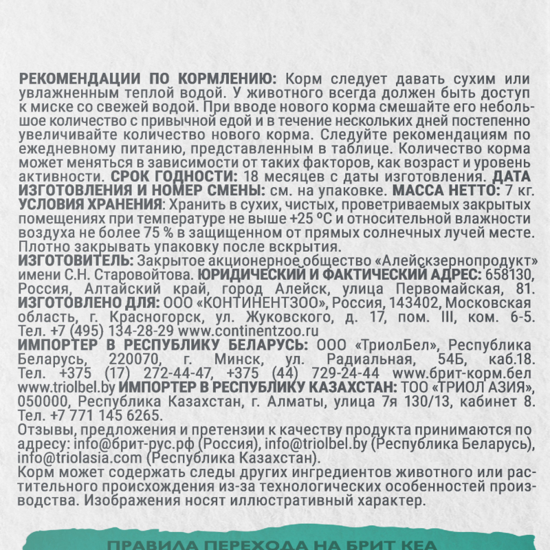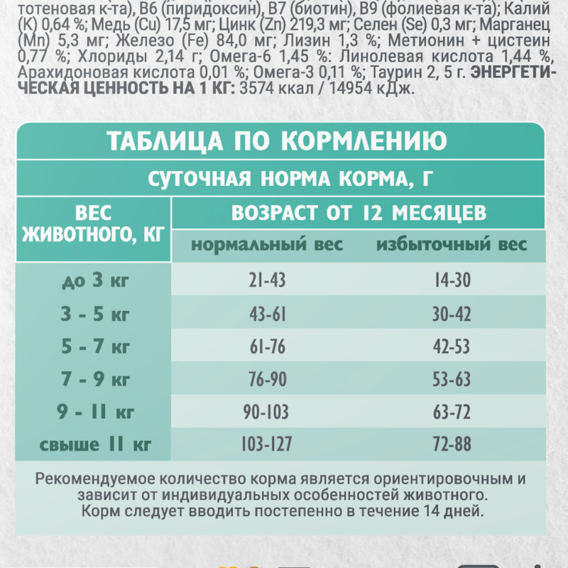 Состав: Мясо птицы 48 % (дегидрированное мясо индейки 27 %, свежее мясо и субпродукты индейки 17 %, свежее мясо утки 4 %), рис цельнозерновой, ячмень цельнозерновой, животный жир 7,5 % (источник Омега-6 жирных кислот), желтый горох, клетчатка свекловичная, растительный протеин (в том числе картофельный и гороховый), гидролизованный животный белок 3,5 %, витаминно-минеральный комплекс, пивные дрожжи, сушеное яблоко (источник растворимых пребиотических волокон), сушеная морковь, льняное семя, холин-хлорид, таурин, DL-метионин, корень цикория, новозеландская мидия (источник хондропротекторов), розмарин, экстракт цветков календулы лекарственной (источник каротина, органических кислот и витаминов, профилактирующих заболевания ЖКТ и стимулирующих регенерацию кожи и шерсти), сублимированные ягоды клюквы (источник органических кислот, профилактирующих МКБ), хондроитин, глюкозамин, антиоксиданты (витамин Е, экстракт розмарина, натуральные токоферолы), L-карнитин, юкка Шидигера.