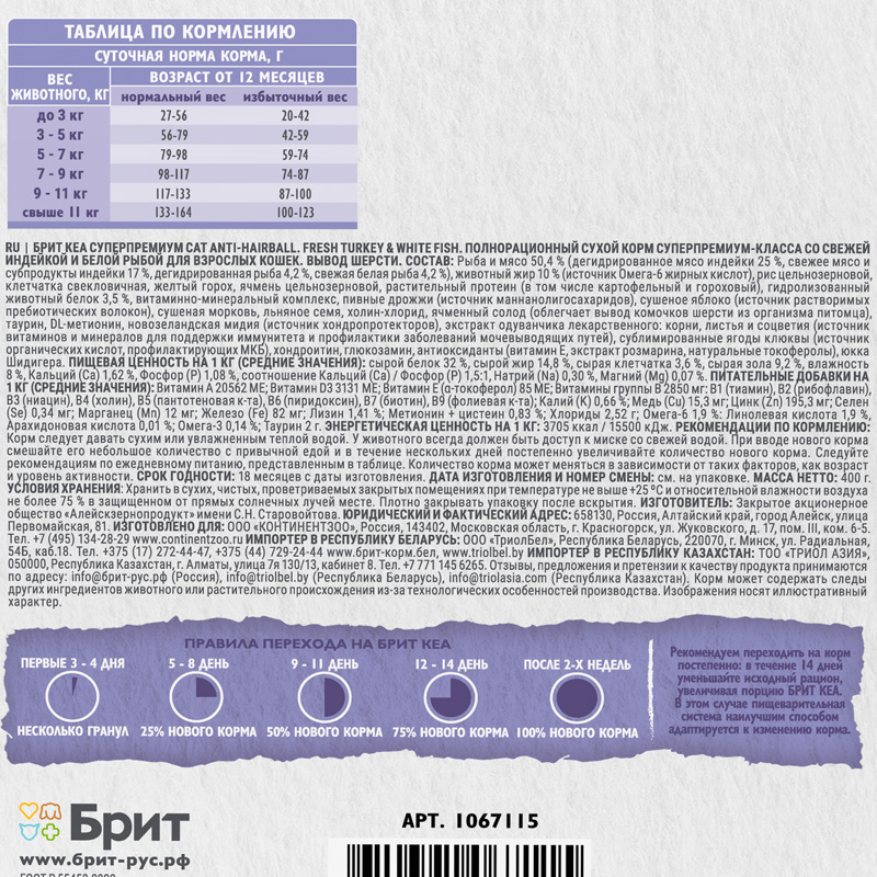 Брит Кеа Cat Anti-Hairball (Белая рыба, индейка) — полнорационный сухой корм суперпремиум-класса для выведения шерсти из желудка взрослых кошек.