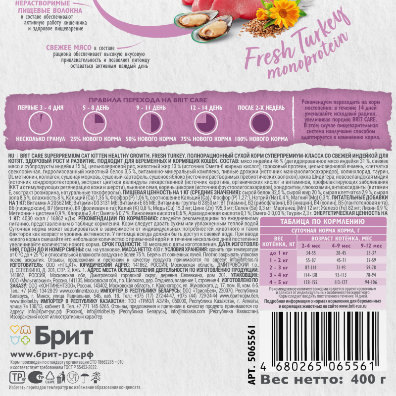 Брит Кеа Kitten Healthy Growth сухой корм для котят, беременных и кормящих кошек (индейка) 400гр