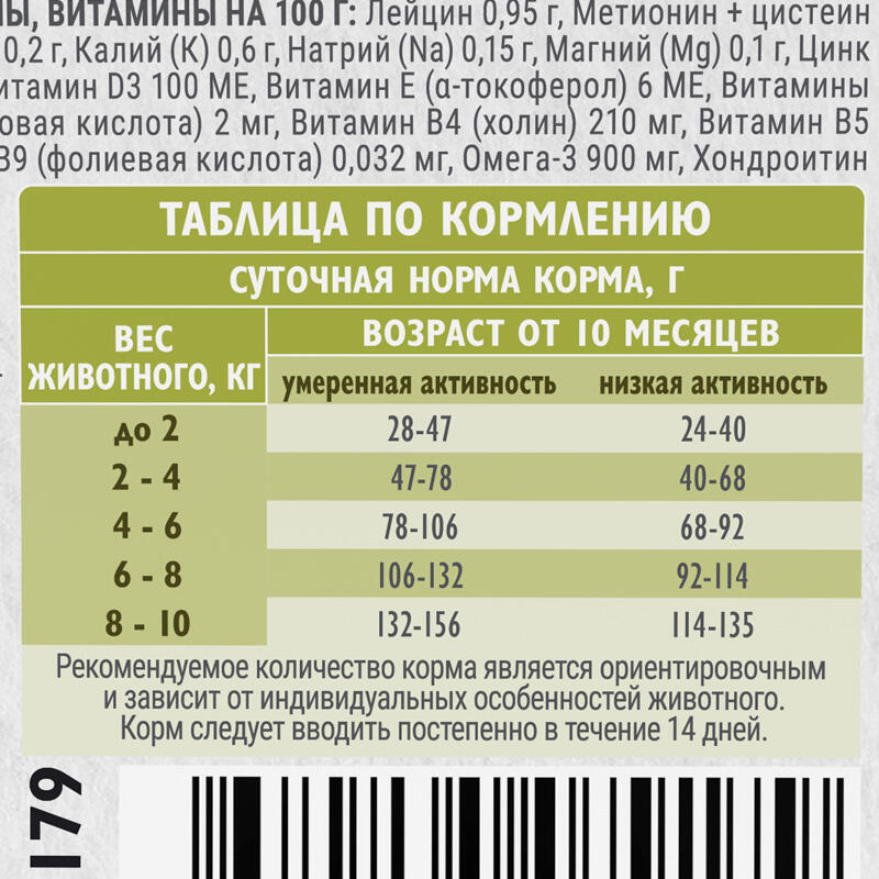 Состав: Мясные и рыбные ингредиенты 42 % (дегидрированное мясо индейки 24 %, свежее мясо индейки 6 %, дегидрированная рыба 5 %, свежий лосось 4 %, животный белок (источник коллагена) 3 %), цельнозерновой ячмень, рис цельнозерновой, животный жир 12 % (источник Омега-6 жирных кислот), желтый горох, клетчатка свекловичная, гидролизованный животный белок 3,5 %, витаминно-минеральный комплекс, рыбий жир (источник Омега-3 жирных кислот), пивные дрожжи (источник маннанолигосахаридов), холинхлорид, сушеное яблоко (источник растворимых пребиотических волокон), корень цикория (источник фруктоолигосахаридов), метионин, сушеная морковь, сушеный картофель, коллаген (очищенный, легкоусвояемый), экстракт цветков календулы лекарственной (источник каротина, органических кислот и витаминов, профилактирующих заболевания ЖКТ и стимулирующих регенерацию кожи и шерсти), юкка Шидигера, новозеландская мидия (источник хондропротекторов), льняное семя, сушеный томат, хондроитин, глюкозамин, антиоксиданты (витамин Е, экстракт розмарина, натура