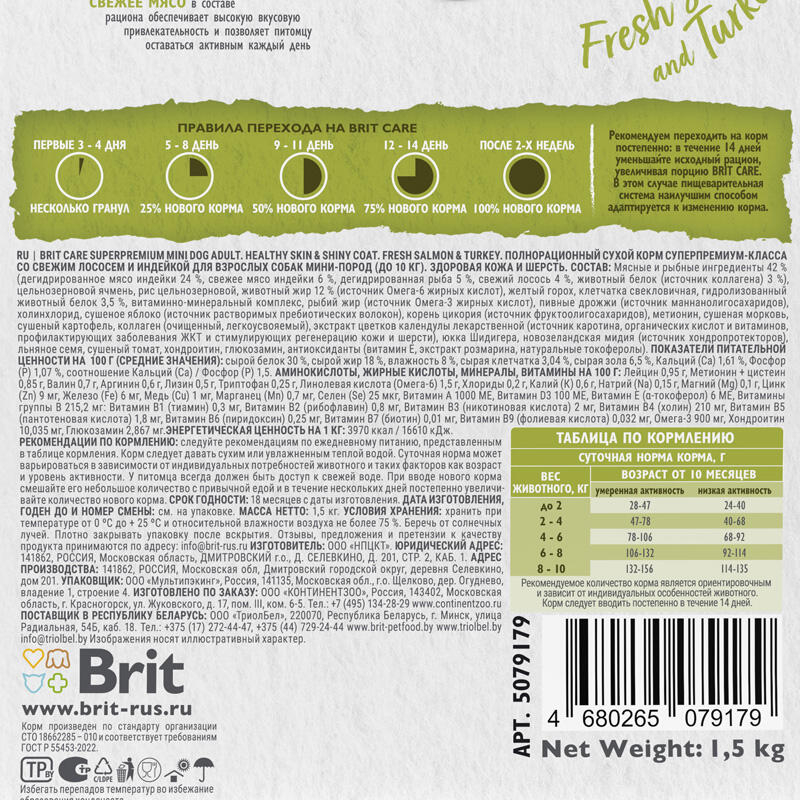 BRIT CARE SUPERPREMIUM MINI DOG ADULT. HEALTHY SKIN & SHINY COAT. FRESH SALMON & TURKEY. ПОЛНОРАЦИОННЫЙ СУХОЙ КОРМ СУПЕРПРЕМИУМ-КЛАССА СО СВЕЖИМ ЛОСОСЕМ И ИНДЕЙКОЙ ДЛЯ ВЗРОСЛЫХ СОБАК МИНИ-ПОРОД (ДО 10 КГ). ЗДОРОВАЯ КОЖА И ШЕРСТЬ.