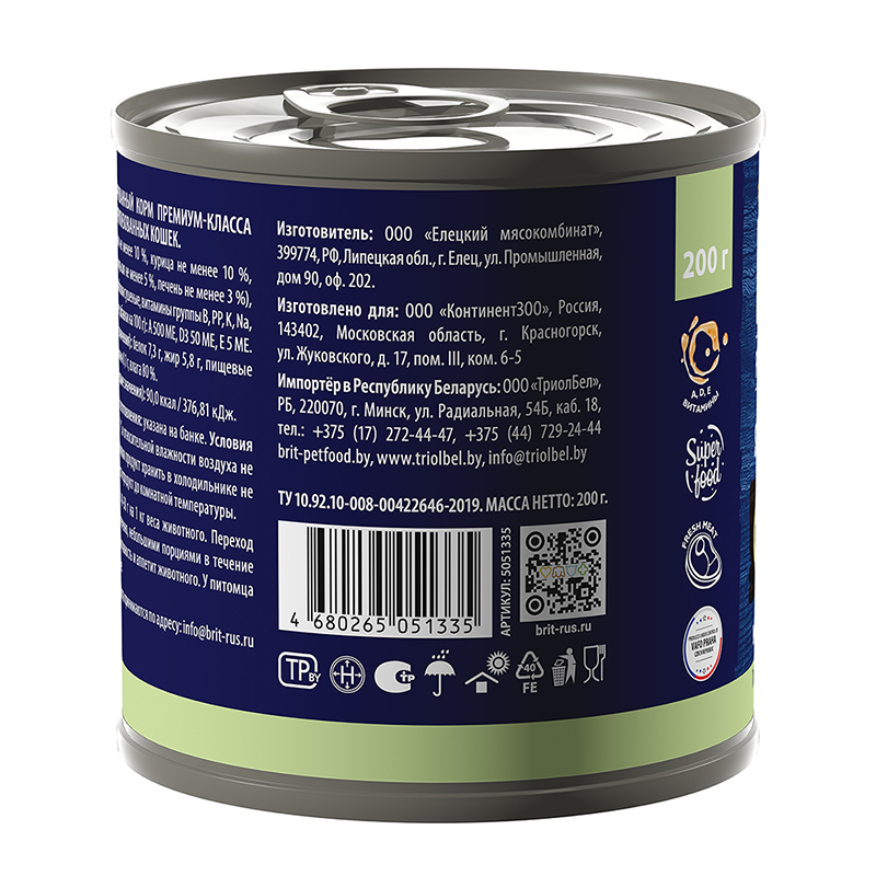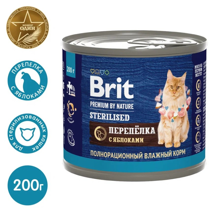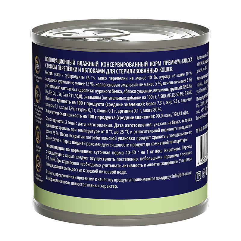 Brit Консерва для стерилизованных кошек (мясо перепёлки, яблоко), 200г