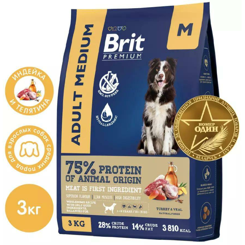 Brit Premium Dog Adult Medium – полнорационный сухой корм премиум-класса с индейкой и телятиной для взрослых собак средних пород (10–25 кг).