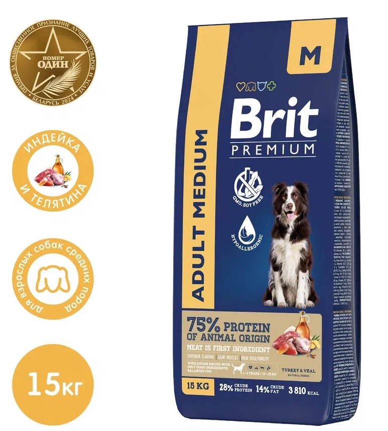 Brit Premium Medium Корм сухой для собак средних пород (индейка, телятина), 15кг