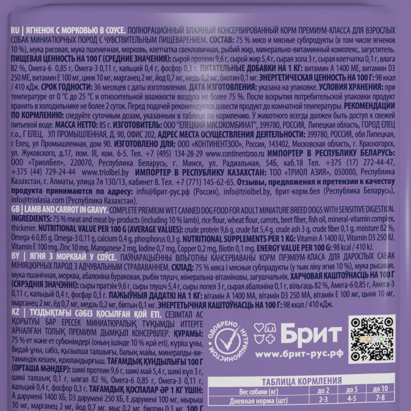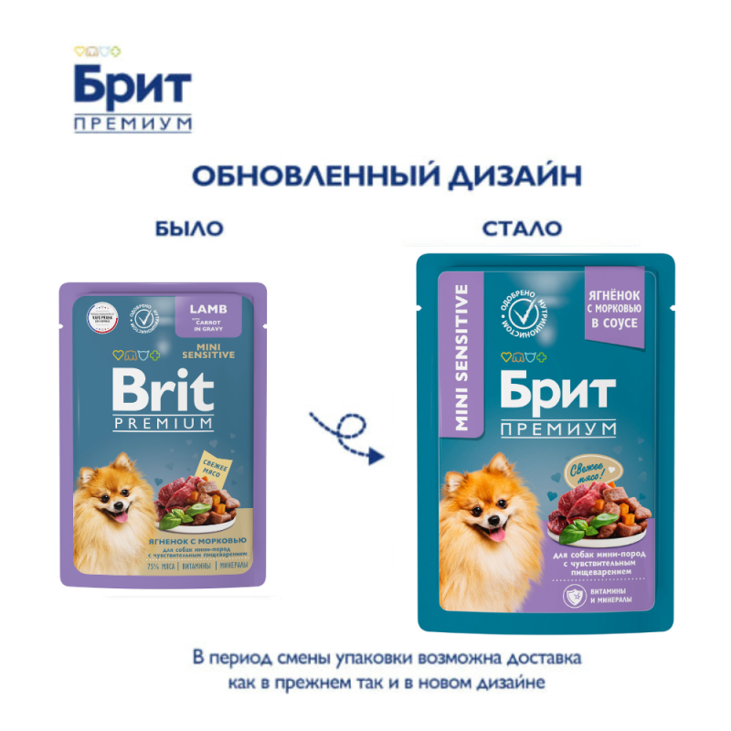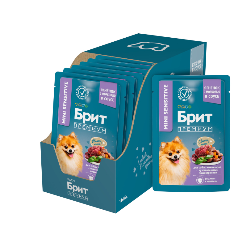 Brit Premium Пауч для собак мини-пород с чyвствительным пищеварением (Ягненок с морковью в соусе) – полнорационный влажный корм премиум класса с ягненком и морковью в соусе для взрослых собак мини-пород с чувствительным пищеварением.