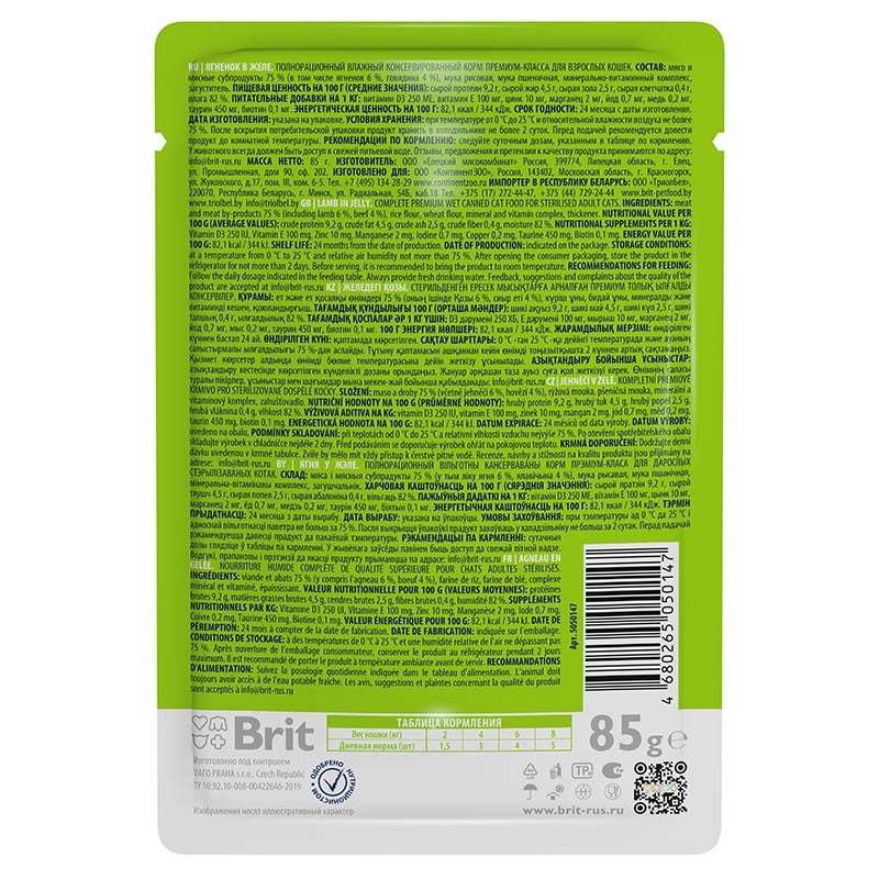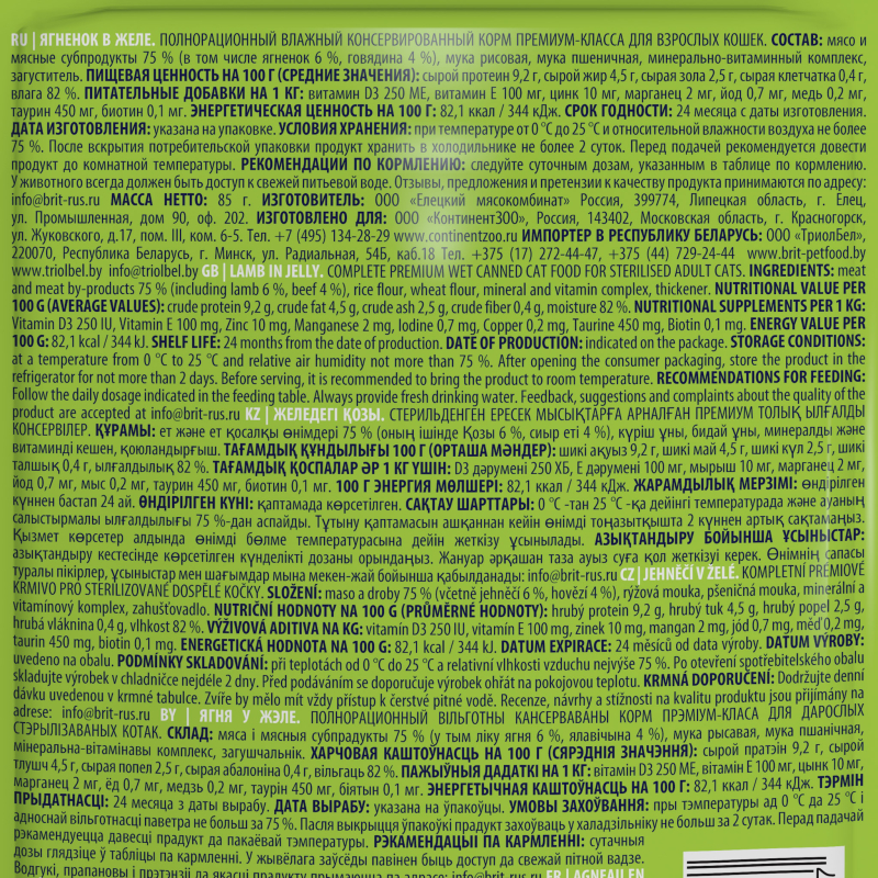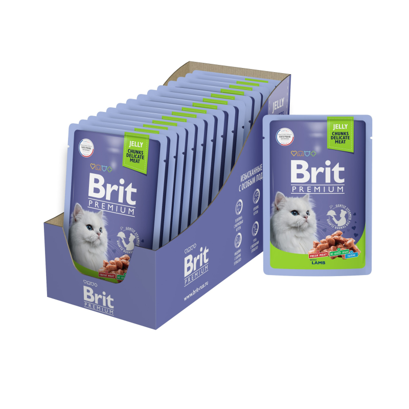 Нежные кусочки ягненка в аппетитном желе - идеальное сочетание для полноценного и сбалансированного рациона. Паучи Brit Premium однозначно заинтересуют вашу кошку и станут для нее любимым блюдом. Влажный корм содержит все необходимые витамины и минералы, которые необходимы питомцу. Таурин в составе – важный ингредиенты для поддержания остроты зрения и здоровья сердечно-сосудистой системы кошек.