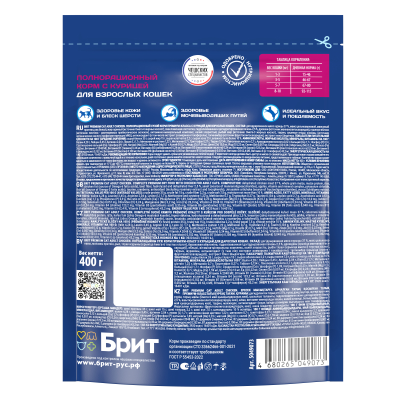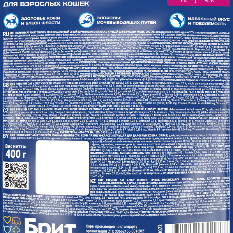 БРИТ Премиум сухой корм ЭДАЛТ для кошек(курица),400гр