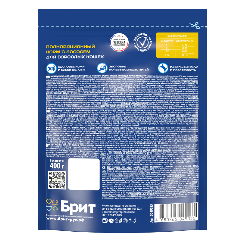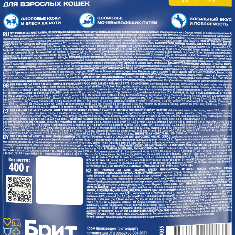 БРИТ Премиум сухой корм ЭДАЛТ для кошек(лосось),400гр