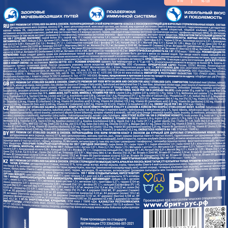 БРИТ Премиум сухой корм СТЕРИЛАЙЗ для стерилизованных кошек(лосось с курицей),400гр