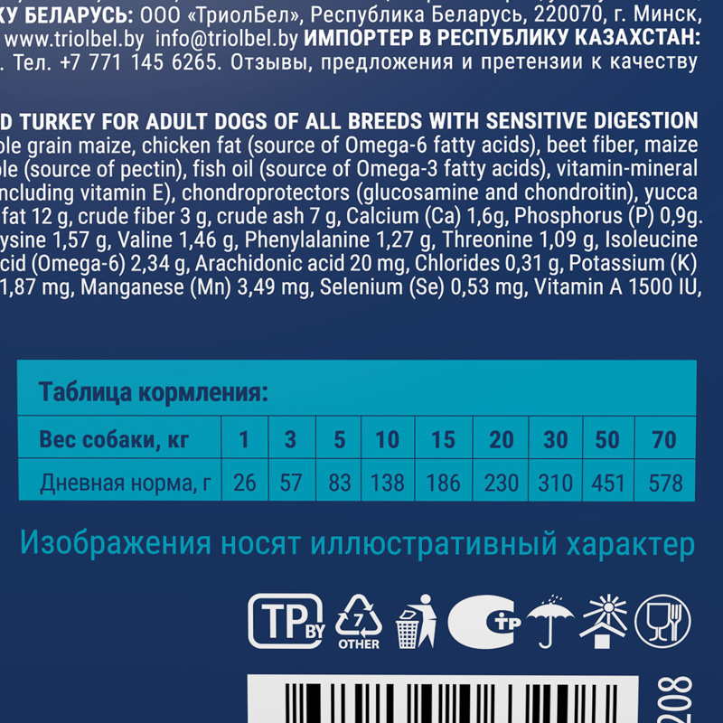 Питательные добавки на 1 кг: кальций (Ca) 16 г, фосфор (P) 9 г, селен (Se) 2 г, лизин (L) 13 г, натрий (Na) 1 г, хлориды (Cl) 1,4 г, метионин и цистеин 8,4 г, триптофан 2 г, магний (Mg) 0,9 г, калий (K) 2,9 г, железо (Fe) 186 мг, марганец (Mn) 21 мг, йод (I) 0,4 мг, витамин А 15000 мг, витамин D3 900 мг, Витамин Е (α–токоферол) 300 мг, витамин В1 (тиамин) 2,7 мг, витамин В2 (рибофлавин) 7 мг, витамин В3 15 мг, витамин В4 900 мг, витамин В5 6 мг, витамин В6 2,1 мг, витамин В12 0,04 мг, биотин 0,36 мг, фолиевая кислота 3 мг, таурин 0,1 мг, медь (Cu) 17 мг.
