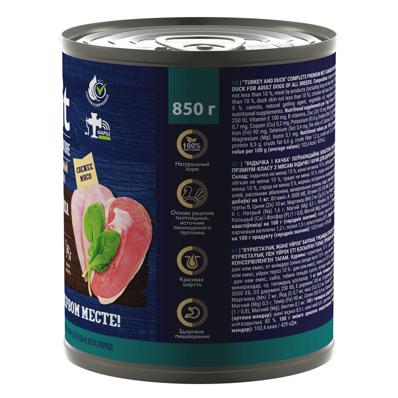 Полнорационный влажный консервированный корм премиум-класса с мясом индейки и утки для собак всех пород, 850 гр