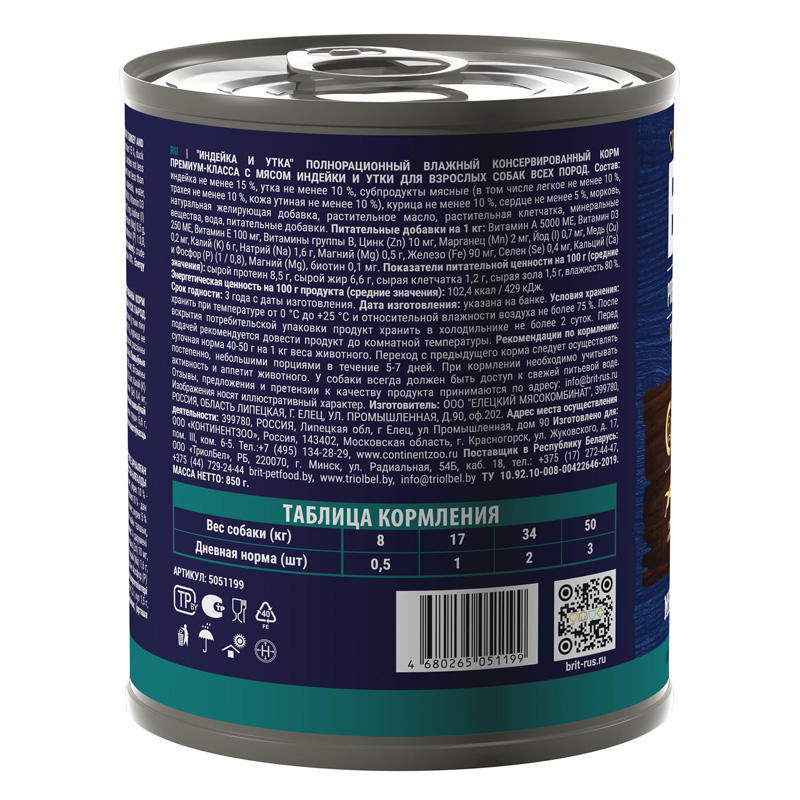 Брит влажный корм для собак (индейка, утка) 850гр