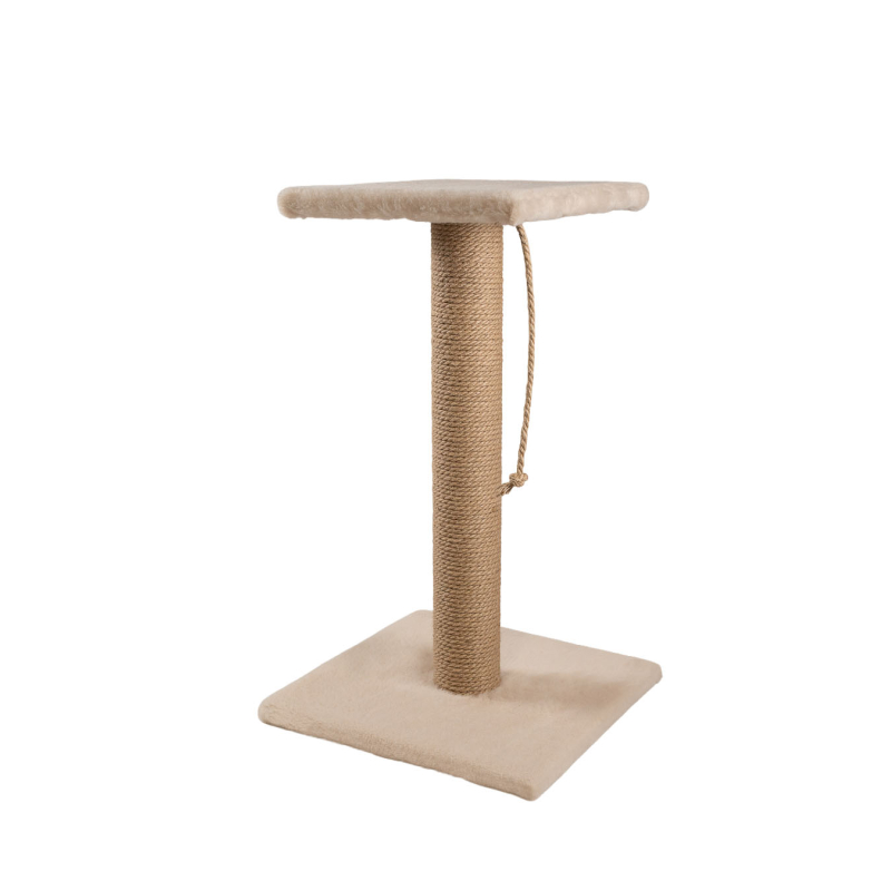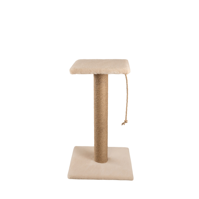Данная модель представляет собой две полки, обтянутые плюшем и закрепленные на столбике, обкрученном джутом. Диаметр столбика - 10 см., размер основания - 42х42 см. Для развлечений к верхней платформе прикреплена игрушка на резинке.