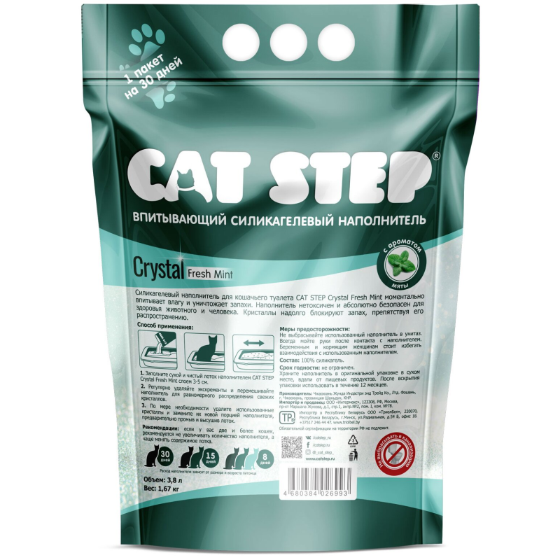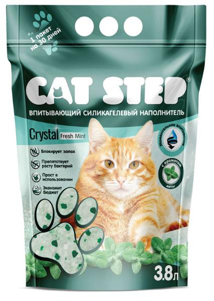 Cat Step Crystal Мята - это впитывающий сиилкагелевый наполнитель для кошачьих туалетов. Моментально впитывает влагу и уничтожает запахи. Кристаллы надолго блокируют неприятный запах, препятствуя его распространению, а зеленые гранулы освежают помещение легким ароматом мяты.