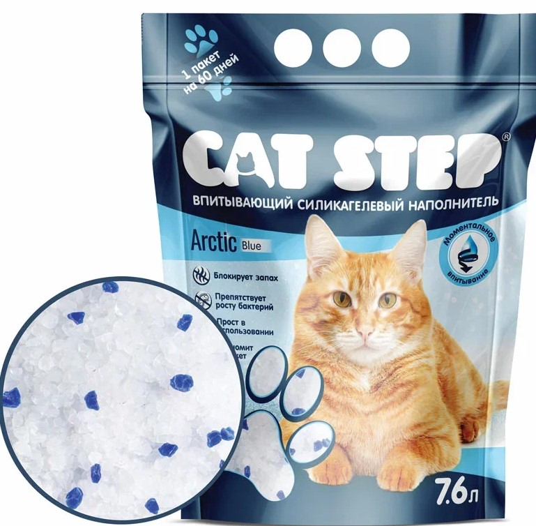 Cиликагелевый наполнитель для кошачьего туалета CAT STEP Arctic Blue с цветными синими гранулами моментально впитывает влагу и уничтожает запахи. Миллионы микроскопических пор в каждом кристалле наполнителя "Cat Step" обеспечивают мгновенное поглощение жидкости и запаха, запирая их внутри.