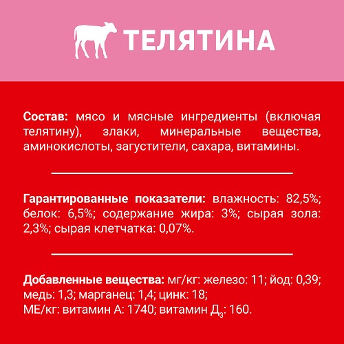 Состав: мясо и мясные ингредиенты (включая телятину), злаки, минеральные вещества, аминокислоты, загустители, сахара, витамины.