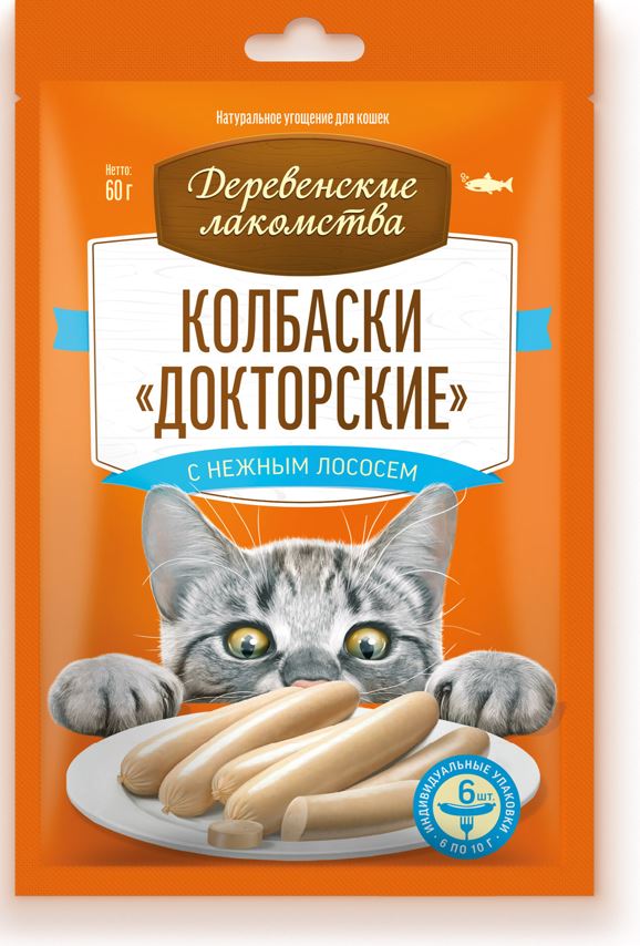 Деревенские лакомства для кошек Колбаски "Докторские" с нежным лососем 60гр