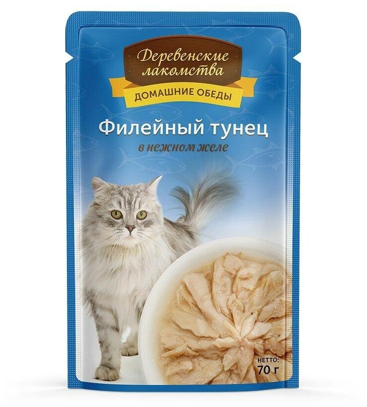 "Деревенские лакомства" Филейный тунец в нежном желе - это консервированный корм для взрослых кошек.