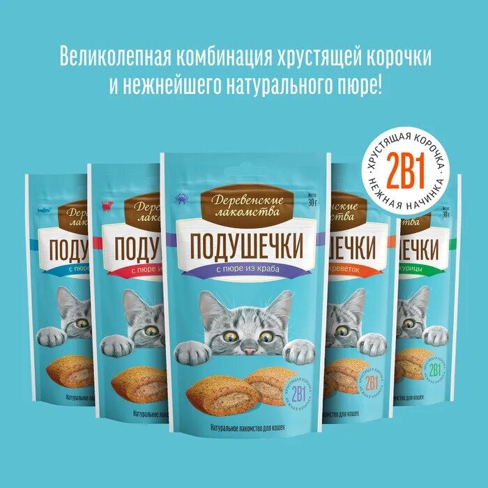 Подушечки с пюре из краба для кошек - великолепная комбинация из хрустящей корочки и нежнейшего натурального пюре из краба делают это лакомство любимым угощением кошки, а пористая структура помогает питомцу чистить зубы.