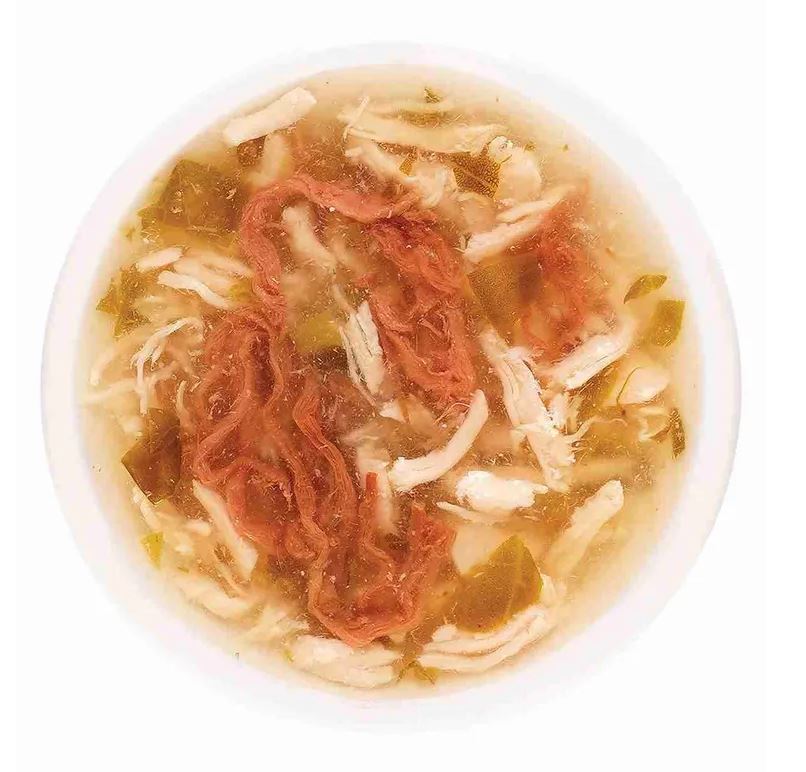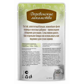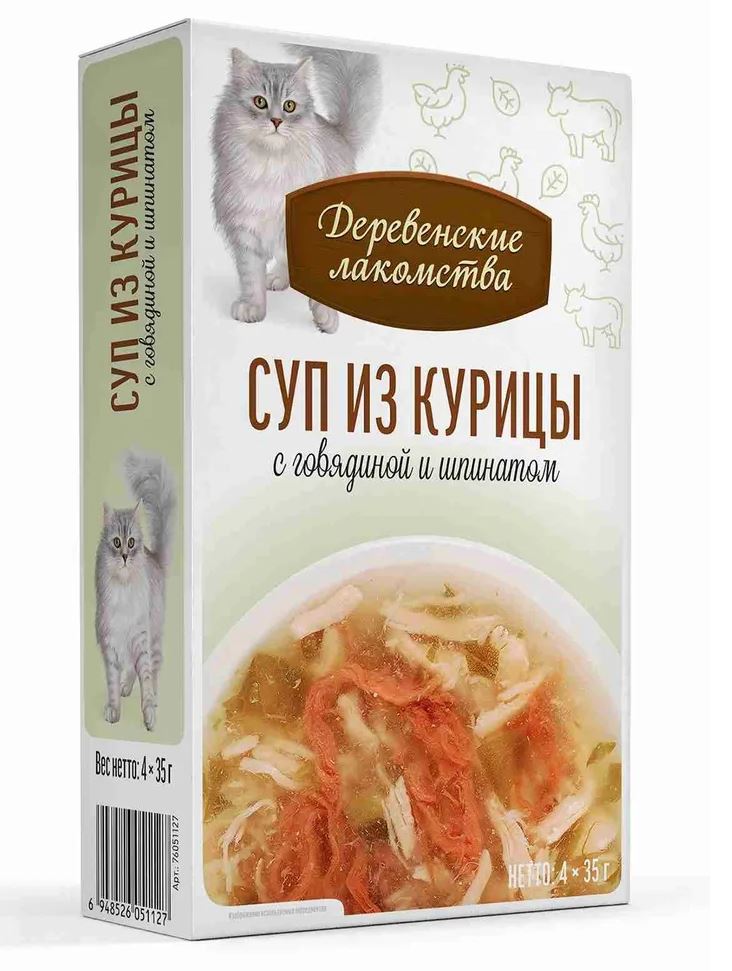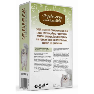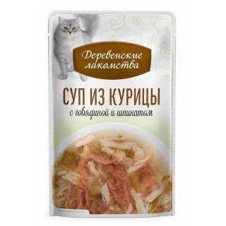 Деревенские лакомства Суп из курицы с говядиной и шпинатом - нежнейшее филе курицы, полезные шпинат и говядина получили идеальное сочетание с густым бульоном в супе для кошек.