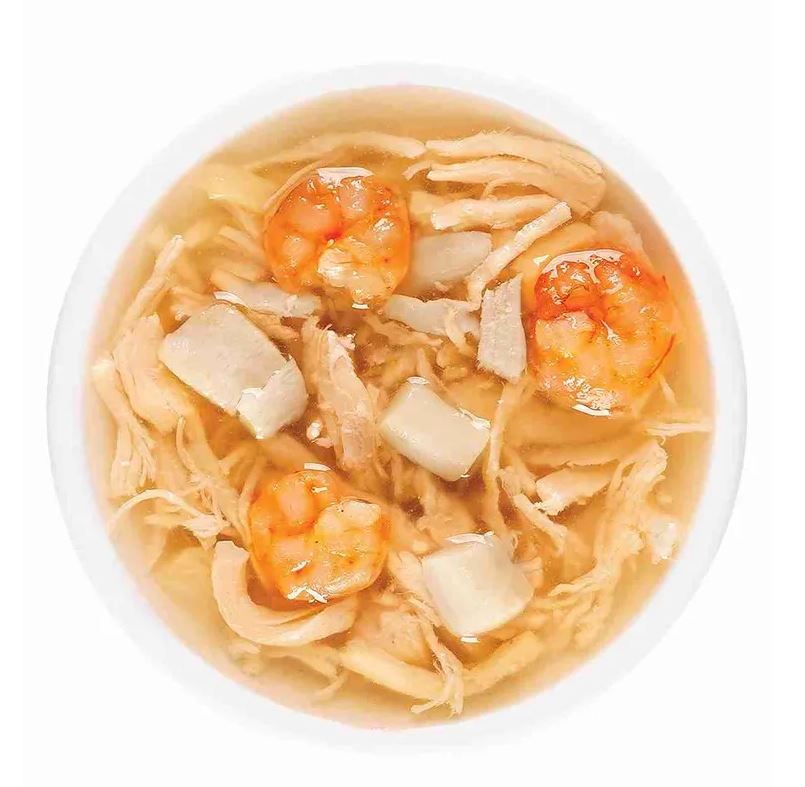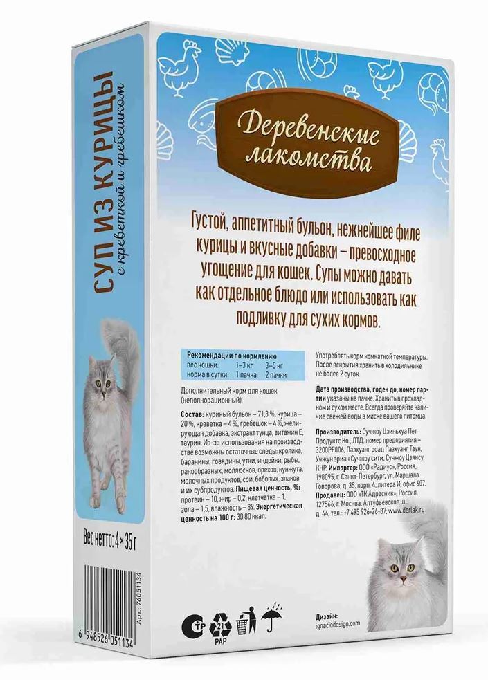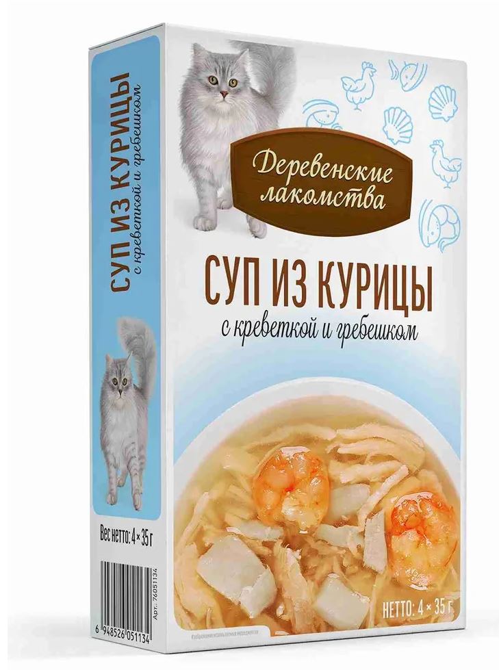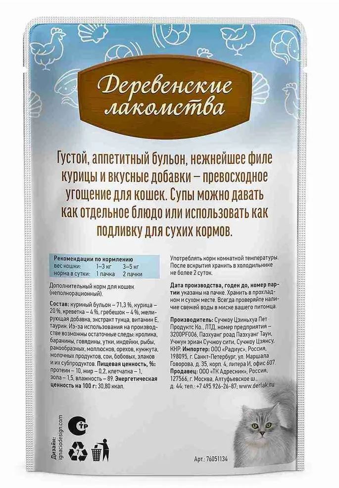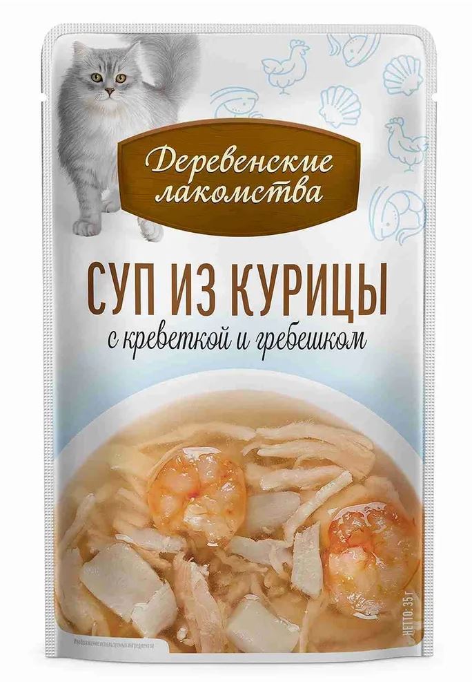 Деревенские лакомства Суп из курицы с креветкой и гребешком - нежнейшее филе курицы, креветка и гребешок получили идеальное сочетание с густым бульоном в супе для кошек.